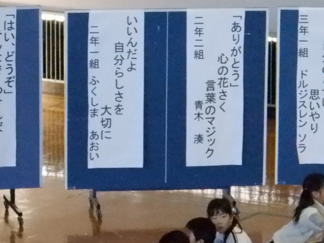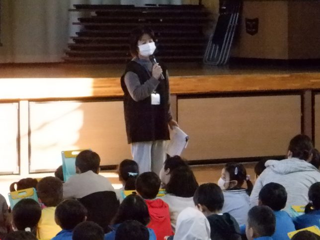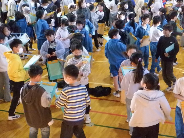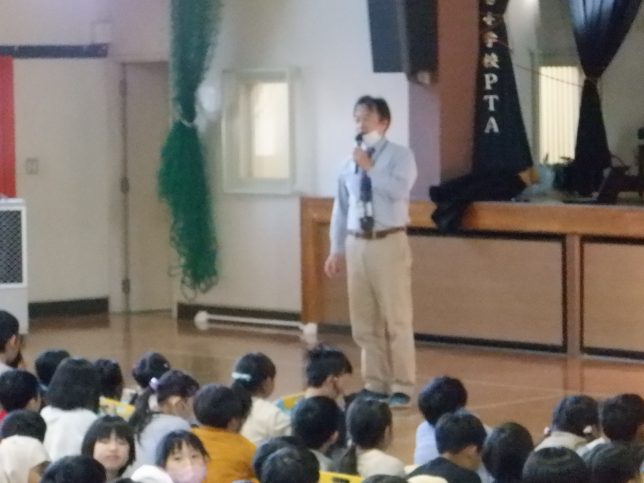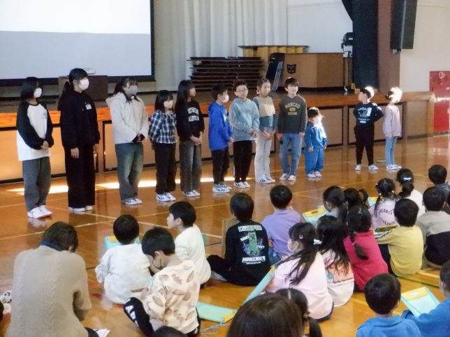 5時間目に全学年で人権集会をひらきました。人権週間に、全員が人権標語を作りました。各クラスで代表に選ばれた12人による標語のお披露目がありました。その標語にこめられた思いを担任の先生が話をしました。皆、しっかりと耳を傾けていました。その後、皆が仲良くなれるゲームをして楽しむことができました。