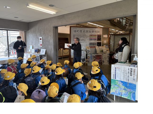 3年生が社会科の勉強で歴史資料館に行きました。昔の生活に使った様々な道具や境町で出土した土器のかけらや埴輪等のレプリカを見学しました。見学した感想を聞いてみると、「もっと見学をしたかった。」「家族と一緒に行ってみたい。」等、楽しい中にも学びの多い見学となりました。