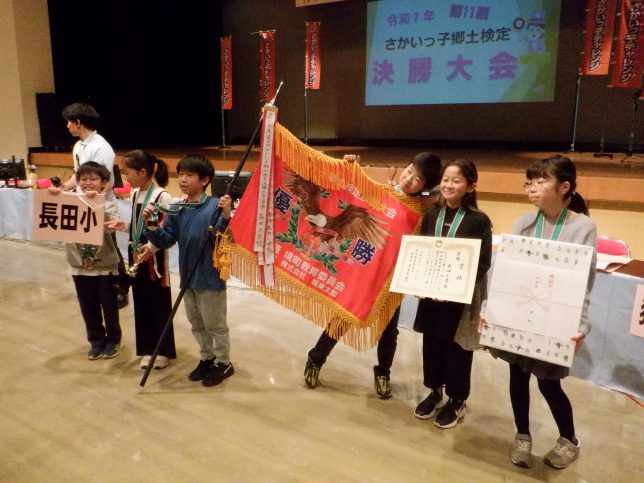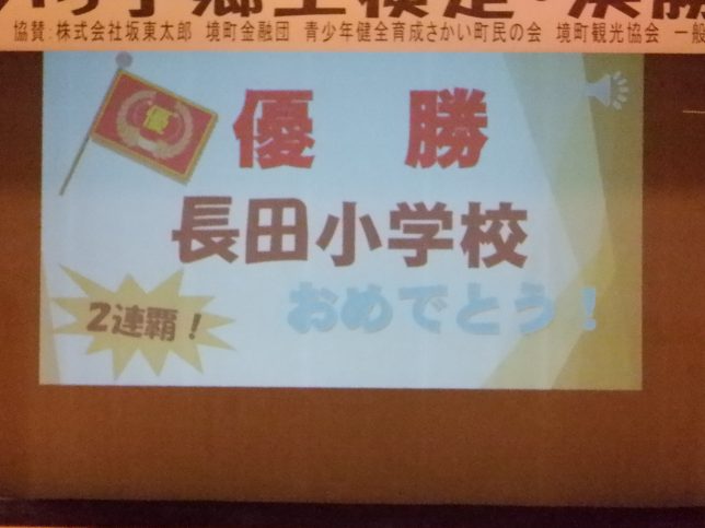 さかいっ子郷土検定が中央公民館で行われました。町内5つの小学校の代表が、境町についてのさまざまなクイズにチャレンジします。まるで高校生のウルトラクイズのようです。会場は大盛り上がり。そんな中、長田小の子供たちは冷静に得点を重ね、見事2連覇を果たしました!!頑張りました。