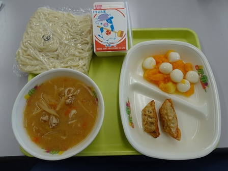 今日の給食のメニューは、ジャージャー麺、牛乳、揚げ餃子、フルーツ和え白玉でした。659キロカロリーでタンパク質は、29.9グラムでした。