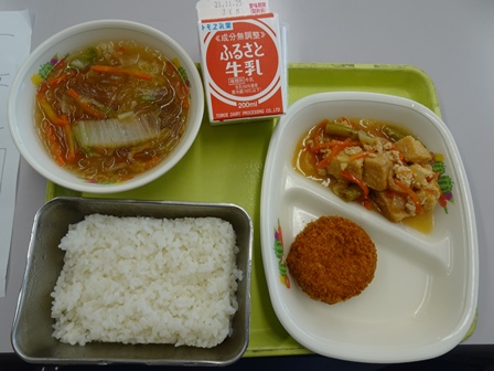 きょうの給食は、ご飯、牛乳、焼き肉カルビメンチカツ、厚揚げのそぼろ煮、白菜よ春雨のスープでした。745キロカロリーでタンパク質は、23.5グラムでした。