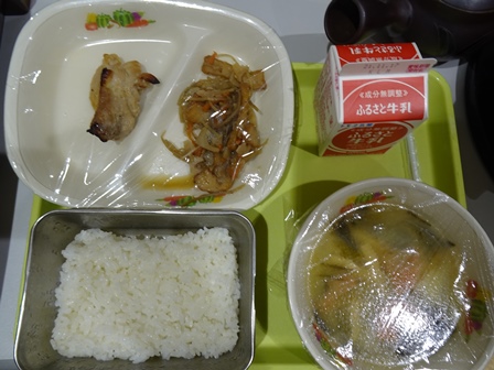 今日の給食は、ごはん、牛乳、鶏肉の梅風味焼き、レンコン入りきんぴら、ジャガイモの味噌汁でした。701キロカロリーでタンパク質は、26.6グラムでした。