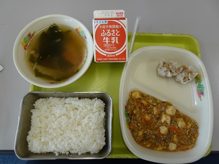 きょうから11月に入りました。きょうの給食のメニューは,ごはん,麻婆豆腐,シュウマイ,醤油,わかめスープでした。645キロカロリーでタンパク質は,24.3グラムでした。