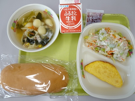 きょうの給食から・・・コッペパン、イチゴジャム、牛乳、オムレツ、シーザーサラダ、マカロニスープでした。698キロカロリーでタンパク質は26.2グラムでした。