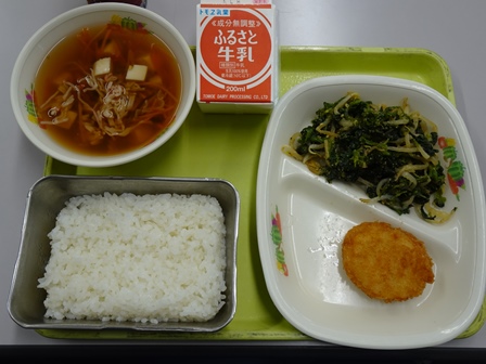 きょうの給食のメニューは、ご飯、牛乳、つくば鳥のチキンカツ、ソース、ほうれん草のゴマ和え、すまし汁でした。660キロカロリーでタンパク質は25.4グラムでした。