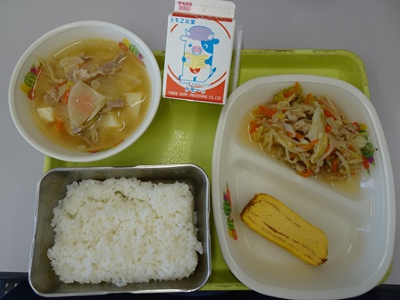 きょうのメニューは、ご飯、牛乳、厚焼き卵、塩野菜炒め、梅山豚の豚汁でした。境町産、タマネギ、梅山豚を使用しています。カロリーは644キロカロリーでタンパク質は23.2グラムでした。