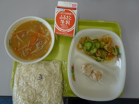 ジャージャー麺(ソフト麺、ジャージャー汁)、牛乳、エビシュウマイ、中華サラダ、中華ドレッシングでした。境町産タマネギを使用しています。カロリーは622キロカロリー、タンパク質は24.6グラムでした。