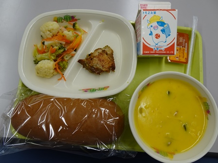 黒パン、蜂蜜マーガリン、牛乳、鶏肉の猿島茶パン粉焼き、カラフルマリネ、パンプキンシチューでした。境町産猿島茶使用です。641キロカロリーでタンパク質は、26.5㌘でした。