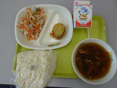 きょうの給食のメニューは、キノコうどん、牛乳、サツマイモの天ぷら、レンコンサラダ、ゴマドレッシングでした。642キロカロリーで、タンパク質は、22.1グラムでした。