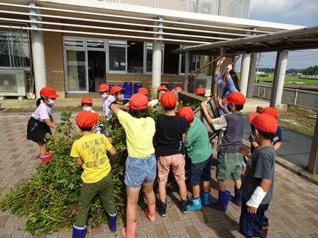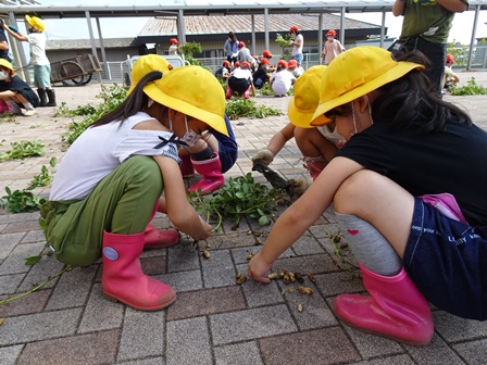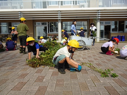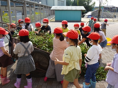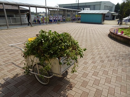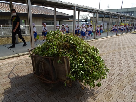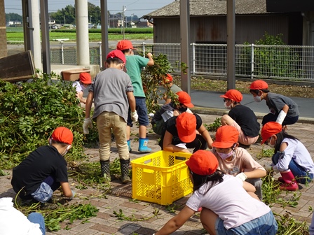 2年生が畑に落花生の収穫に行きました。リアカー2台分の落花生を収穫して帰校しました。その後、落花生を一つづつ丁寧にとっていました。