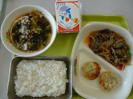 きょうののメニューは、ご飯、牛乳、小松菜まんじゅう、マーボーナス、かき玉スープでした。642キロカロリーでタンパク質は、23.9グラムでした。