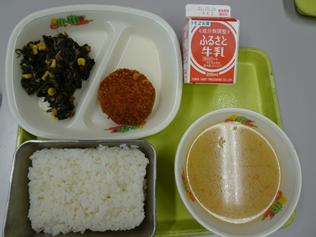 きょうの給食から・・・ご飯、牛乳、ハッシュドビーフコロッケ、ほうれん草のソテー、味噌汁でした。669キロカロリーでタンパク質は30.8㌘でした。