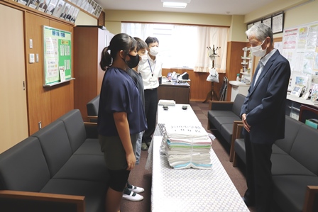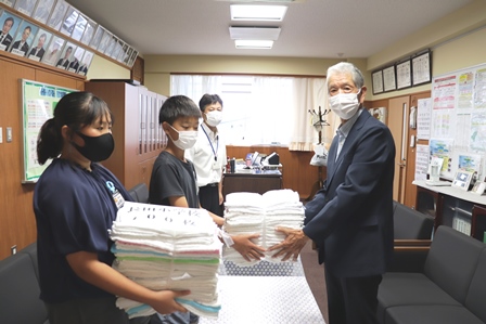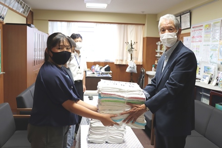 100枚の手作り雑巾を頂きました。6年生の代表2名が受け取りました。大切に使わせていただきます。