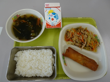 ごはん、牛乳、肉野菜炒め、春巻き、わかめスープでした。カロリーは691キロカロリーでタンパク質は、23.4㌘でした。