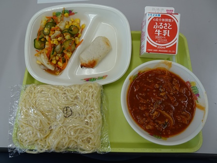 ミートソーススパゲティー、牛乳、チーズロール、キャベツのサラダ、たまねぎドレッシングでした。749キロカロリーでタンパク質は、31.1㌘でした。