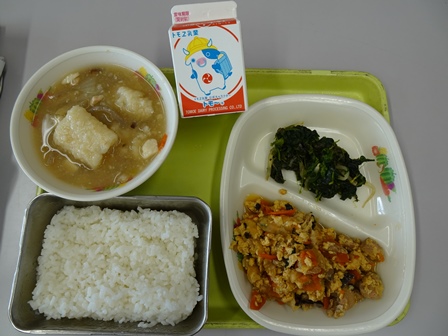 きょうの給食は、親子丼、牛乳、おひたし、わかめスープでした。677キロカロリーで、タンパク質は27.2㌘でした。