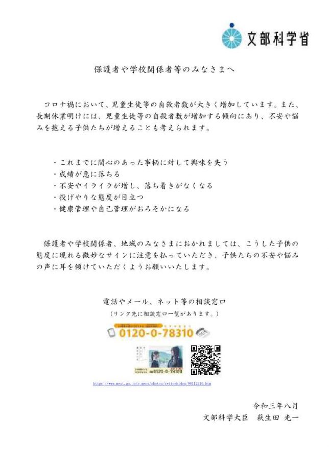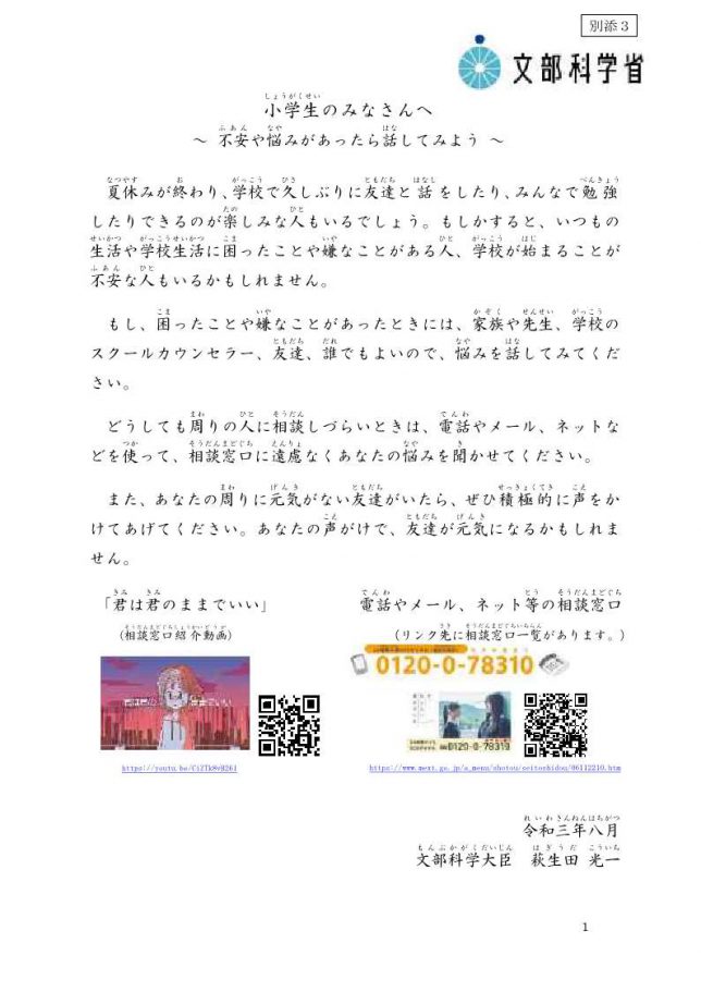 内閣官房孤独・孤立対策担当室において、子ども向けの孤独・孤立対策に関するホームページが新設されましたのでお知らせいたします。下のアドレスをクリックしてください。つながります。
