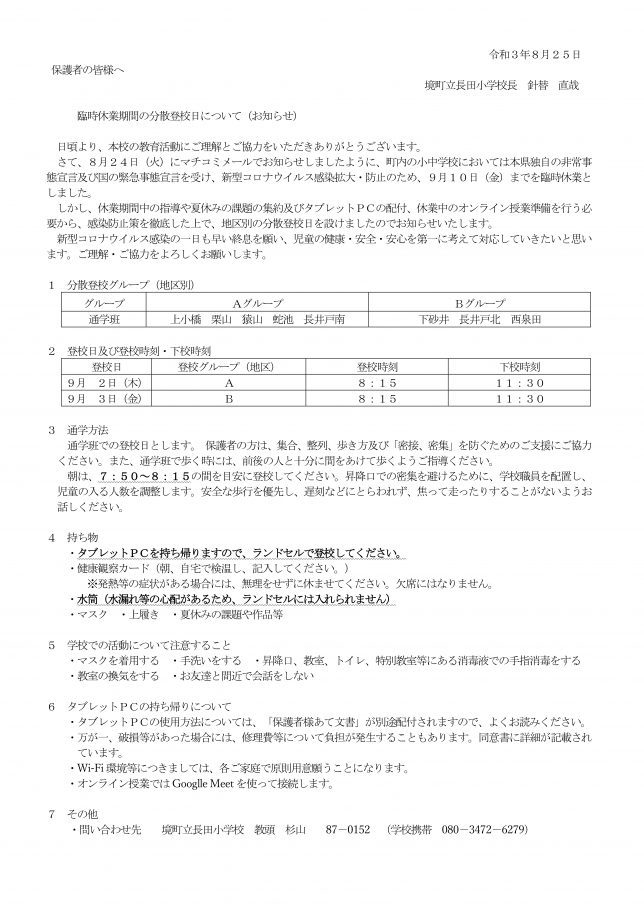 マチコミ等でも配信しましたが、9月2日、3日は地区別分散登校を短時間で実施致します。その2日間で、夏休みの課題の回収や休業に備えたオンライン学習のためのPCの配付等を行います。なお6日~10日は臨時休業となります。