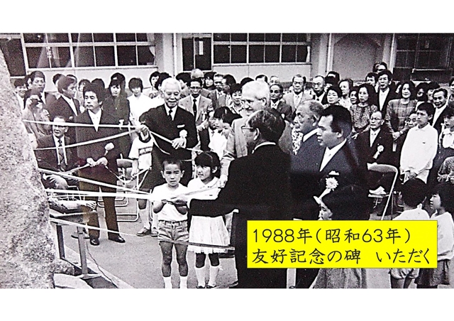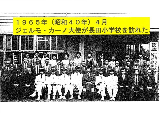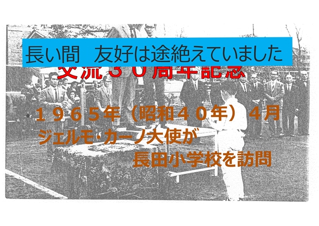 その後、第2次世界大戦等で、長い間友好関係は、途絶えていました。1965年(昭和40年)4月に、ジェルモオ・カーノ大使が、長田小学校(本校)を訪問しまた交流がはじまります。