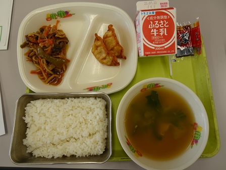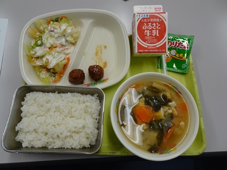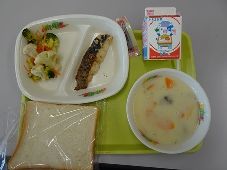 きょうの給食から・・・ご飯、牛乳、レンコンのエビよせ揚げ、ソース、アスパラソテー、春雨スープでした。625キロカロリーで、タンパク質は21.4グラムでした。