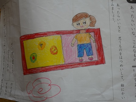 つぎは,2年生の国語です。「あったらいいいなこんなもの」を各々が考えてそれを説明する学習です。