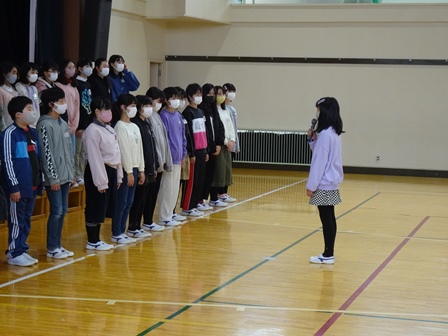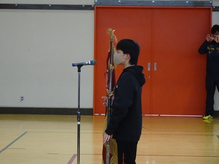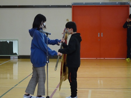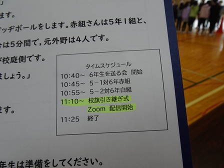 先週に引き続き,第2日目の6年生を送る会です。きょうは4年生,5年生,1年生が送る会を行いました。特に5年生は,校旗の受け渡し式を行いました。この部分はzoomで各クラスに配信しました。これは新しい試みです。