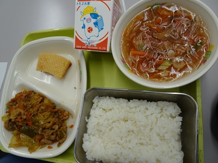きょうは,ご飯,牛乳,イカのバター醤油焼き,回鍋肉,春雨スープでした。608キロカロリーで,タンパク質は27.7グラムでした。