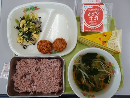 きょうは「卒業お祝い献立」でした。赤飯、パックごま塩、牛乳、エビ鹿の子揚げ、小松菜と卵のソテー、中華スープ、お祝いデザートでした。748キロカロリーでタンパク質は、23.8グラムでした。