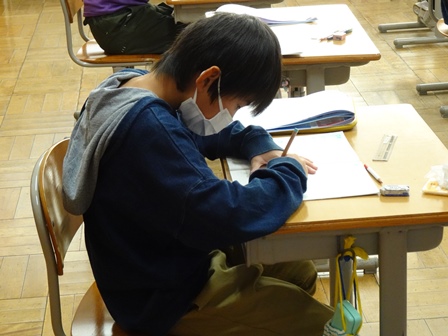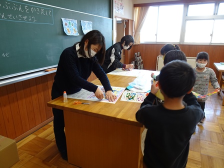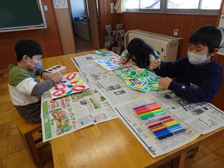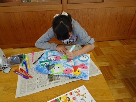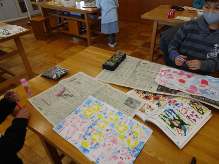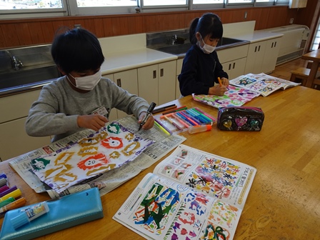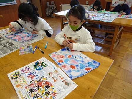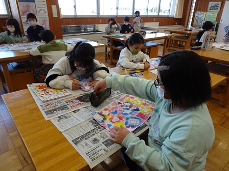 やがて授業がはじまりました。きょうは図工室で2年1組さんが版画の仕上げをしていました。思わずカラフルできれだったのでのぞきました。