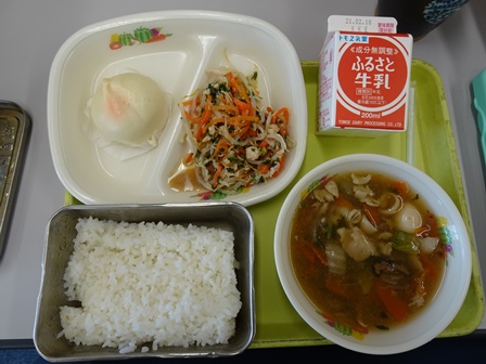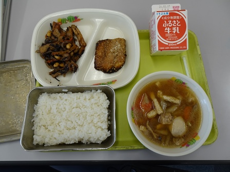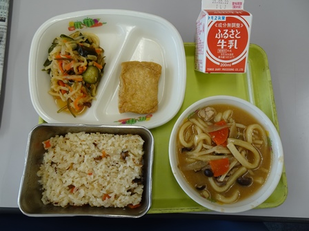 きょうの給食から・・・かき回し(炊き込みご飯),牛乳,信田巻き,切り干し大根と海藻の煮物,味噌煮込みうどんでした。きょうの給食のテーマは,郷土料理の日(愛知県)でした。734キロカロリーでタンパク質は,27.2グラムでした。