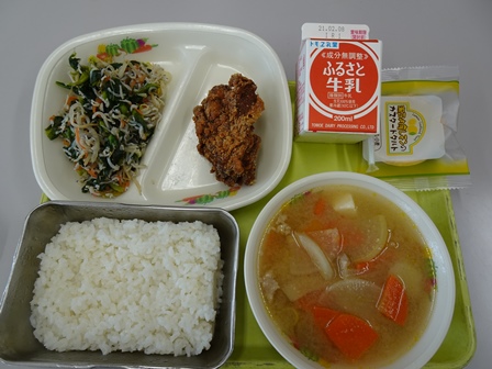 きょうの給食から・・・きょうの給食は静小学校のリクエストメニューでした。米粉で作った鶏肉の唐揚げ(境町産 米粉)、小松菜とちりめんのナムル(ちりめんは茨城県産)、梅山豚の豚汁(梅山豚は境町産)、レモンタルトでした。807キロカロリーでタンパク質は、33.8グラムでした。