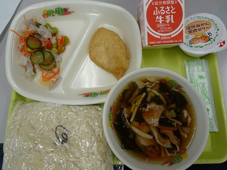 今日の給食を紹介します。五目うどん、牛乳、もちいなり、レンコンサラダ、香味塩ドレッシング、ミカンゼリーでした。674キロカロリーで、タンパク質は21.7グラムでした。
