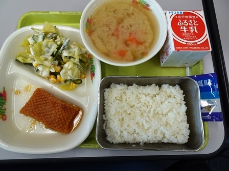1月最後の給食は、郷土料理の日から北海道のメニューでした。ご飯、牛乳、瀬戸風味ふりかけ、イカのかりんあげ、アスパラガスとコーンのサラダ、シーザードレッシング、石狩汁でした。671キロカロリーでタンパク質は27.6グラムでした。