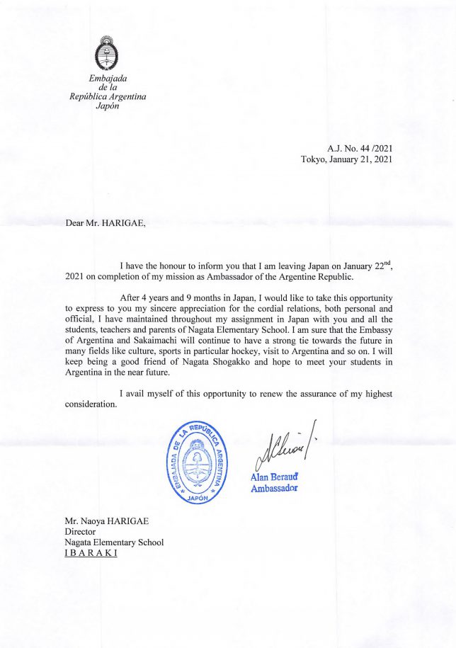 日本に4年9ヶ月滞在した後、個人的にも公的にも、誠実な関係に心からの感謝を表します。私は、あなたと境町立長田小学校のすべての児童、教師、保護者との日本での関係を通じて、アルゼンチン大使館と境町が 文化、スポーツ、特にホッケー、アルゼンチンへの訪問など、多くの分野で未来に向けて強い絆を作ることができました。 私は長田小学校の良い友達であり続け、近い将来アルゼンチンで児童のみなさんと会いたいと思っています。
