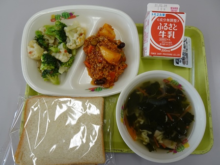 きょうの給食より・・・・きょうは世界の料理の日(アメリカ)がテーマでした。ゆめかおりの食パン、ペアチョコクリーム、牛乳、チリコンカン、ブロッコリーのサラダ、イタリアンドレッシング、マカロニスープでした。615キロカロリーで、タンパク質は22.7グラムでした。