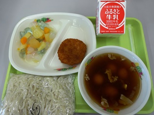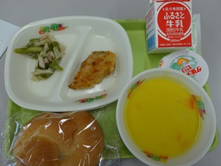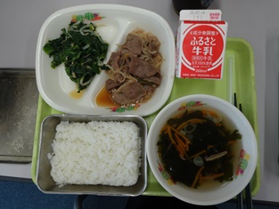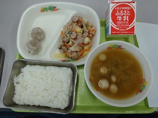 本日の最後も給食の紹介です。ご飯,牛乳,チャンプルー,シュウマイ,アーサ汁でした。きょうの給食にはテーマがついています。きょうは沖縄料理の日ということでした。カロリーは662キロカロリー,タンパク質は26.4グラムでした。