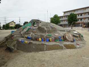 この築山は,昭和38年8月にPTAの奉仕作業で作ったという銘板がありました。他にもたくさんのものがあります。