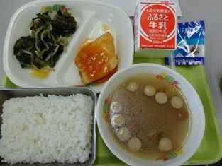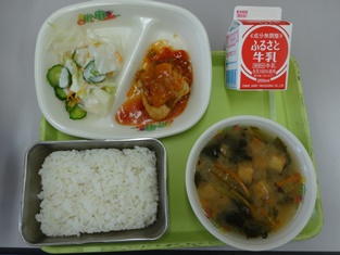 きょうの給食メニューは,ご飯,牛乳,鶏肉のメキシカンソースかけ,キャベツのサラダ,コールスロードレッシング,味噌汁でした。
