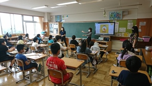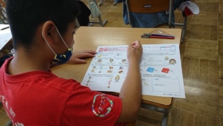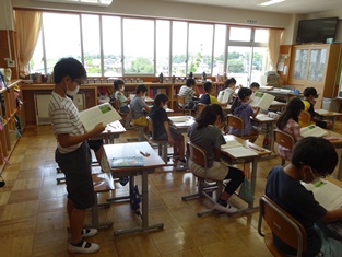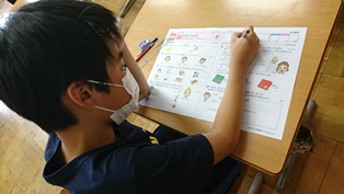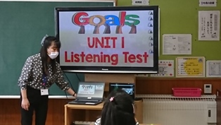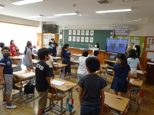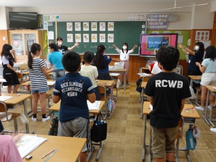 5年2組です。英語の学習中。何月の言い方を今日は学習していました。体と頭を使って楽しく学習です。