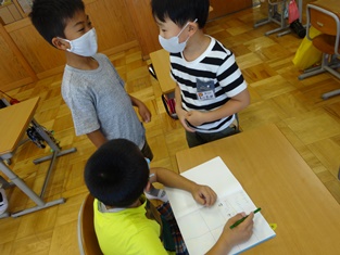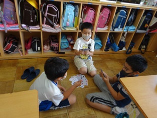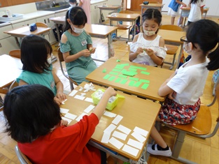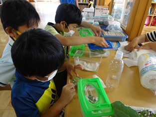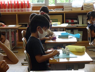 業間の休み時間の様子を紹介します。きょうは,校舎内の様子です。それぞれに折り紙をやったり,モンシロショウの幼虫をみたり,楽しく粘土をやったりと思い思いの姿でした。