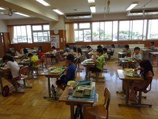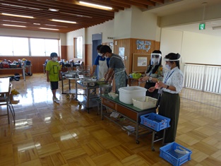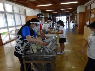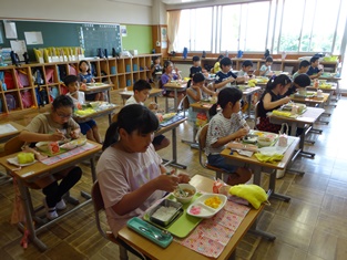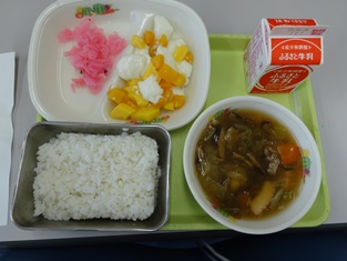 きょうから給食も完全に普通給食に戻りました。今日のメニューは,ご飯,牛乳,中華丼の具,桜大根,フルーツ杏仁でした。