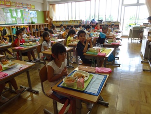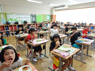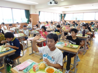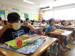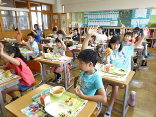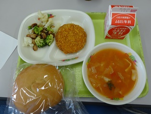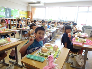今日の給食は,ハムチーズバーガー,牛乳,ブロッコリと豆のサラダ,イタリアンドレッシングです。美味しいですかと聞いてみたら,みんなが手を上げてくれました。