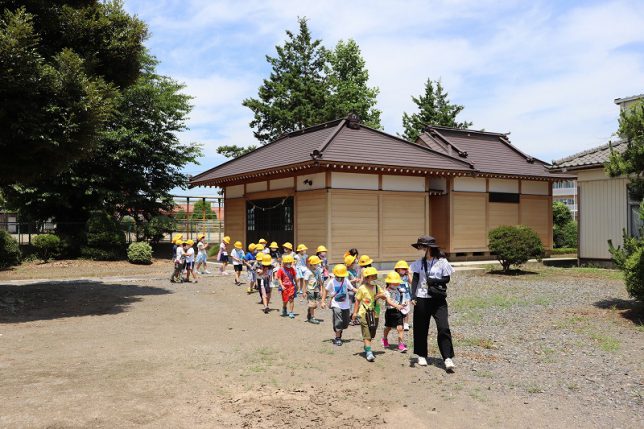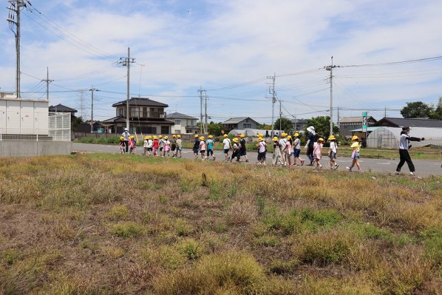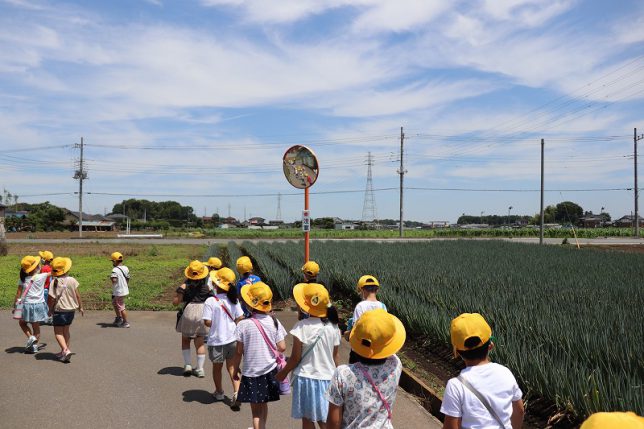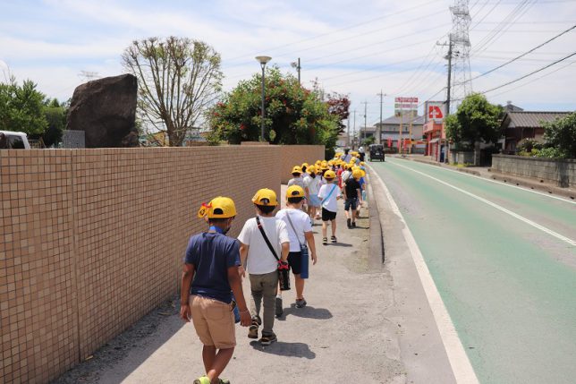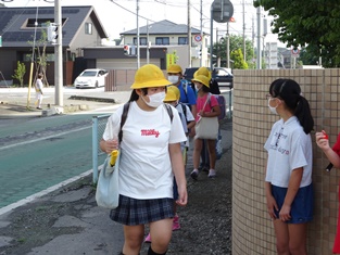 1年生が生活科で学校の周り探検に出かけました。途中の神社でお参りしたり,「あっ,カーブミラーに映ったー。」「ネギが1つだけ花が咲いている。」と発見があったりしました。