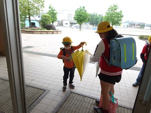 6年生が1年生の傘のたたみ方を教えてあげていました。