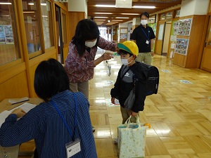 また並んで昇降口を入ります。そして体温を測って教室へ。おうちの検温と学校の検温と健康観察でダブルチェックしています。児童の健康と安全を最優先に。