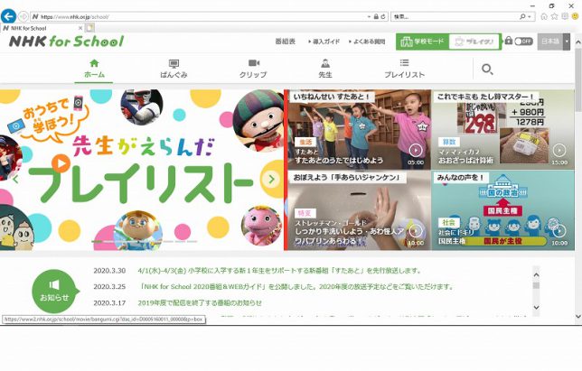 NHK for School にも学習に役立つ楽しい動画がたくさんありますのでご活用ください。 https://www.nhk.or.jp/school/