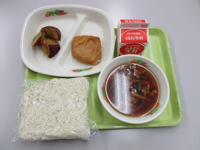 「きのこうどん,牛乳,もちいなり,ひとくちやきいも」でした。秋の味覚いっぱいの給食でした。